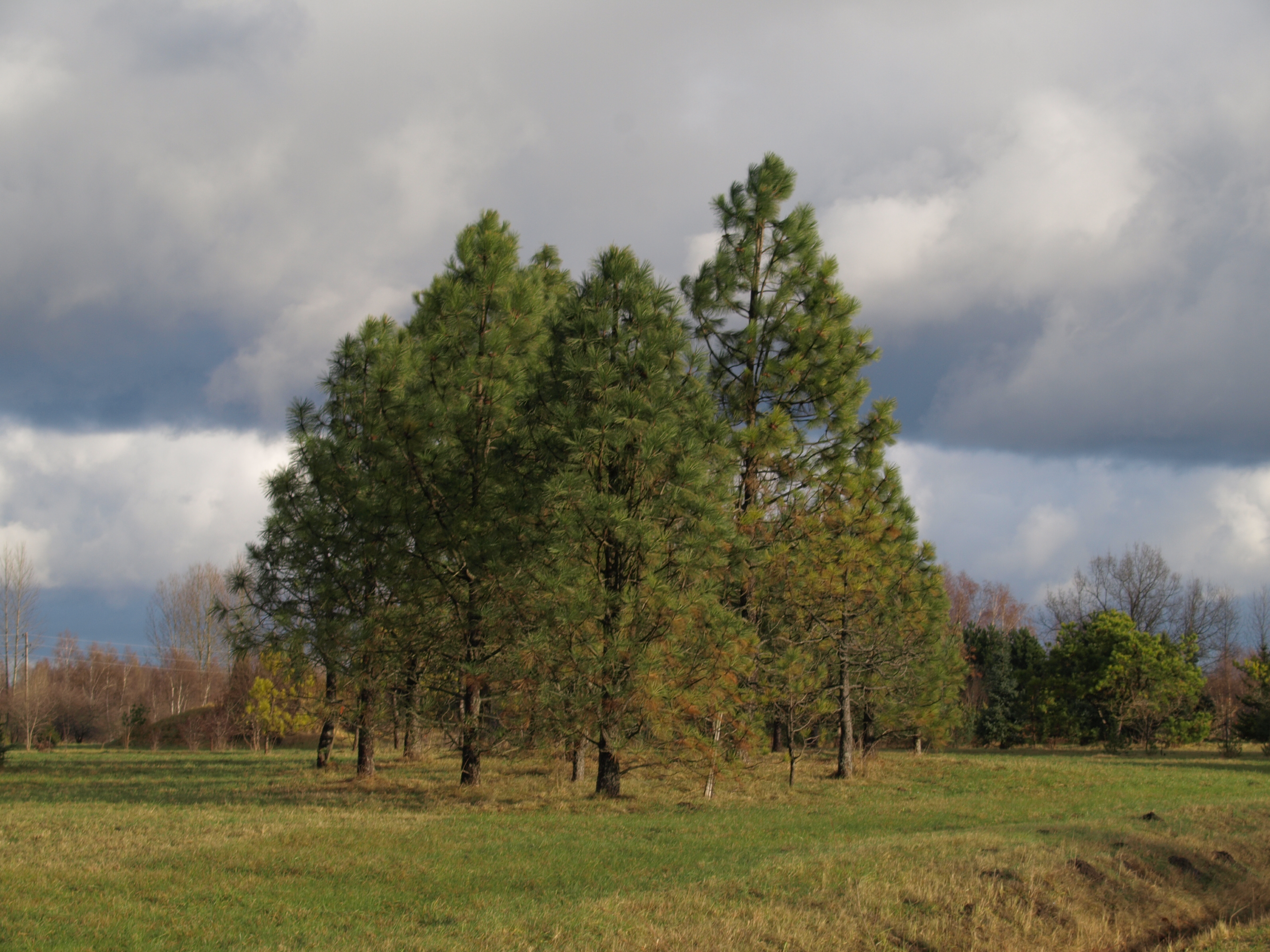 Morfoloģija. Mūžzaļi, dzimtenē līdz 40 m augsti koki ar plati konisku vai noapaļotu vainagu. Miza brūna vai gandrīz melna, dziļi rievaina, atlobās ar plēksnēm. Jaunie dzinumi brūngani vai zaļgani, bez apsarmes. Pumpuri iegareni cilindriski, smaili, sveķaini. Skujas kūlīšos pa 2-3, 12-25 cm garas ar nosmailotu galu, tumši zaļas, maksts paliekoša. Čiekuri pa 1, retāk pa 2, sēdoši, simetriski, olveida līdz iegareni, 8-15 cm gari, gaiši brūni, spīdīgi, nobriest septembrī. Čiekuriem nobirstot, to pamatnes paliek pie zara.