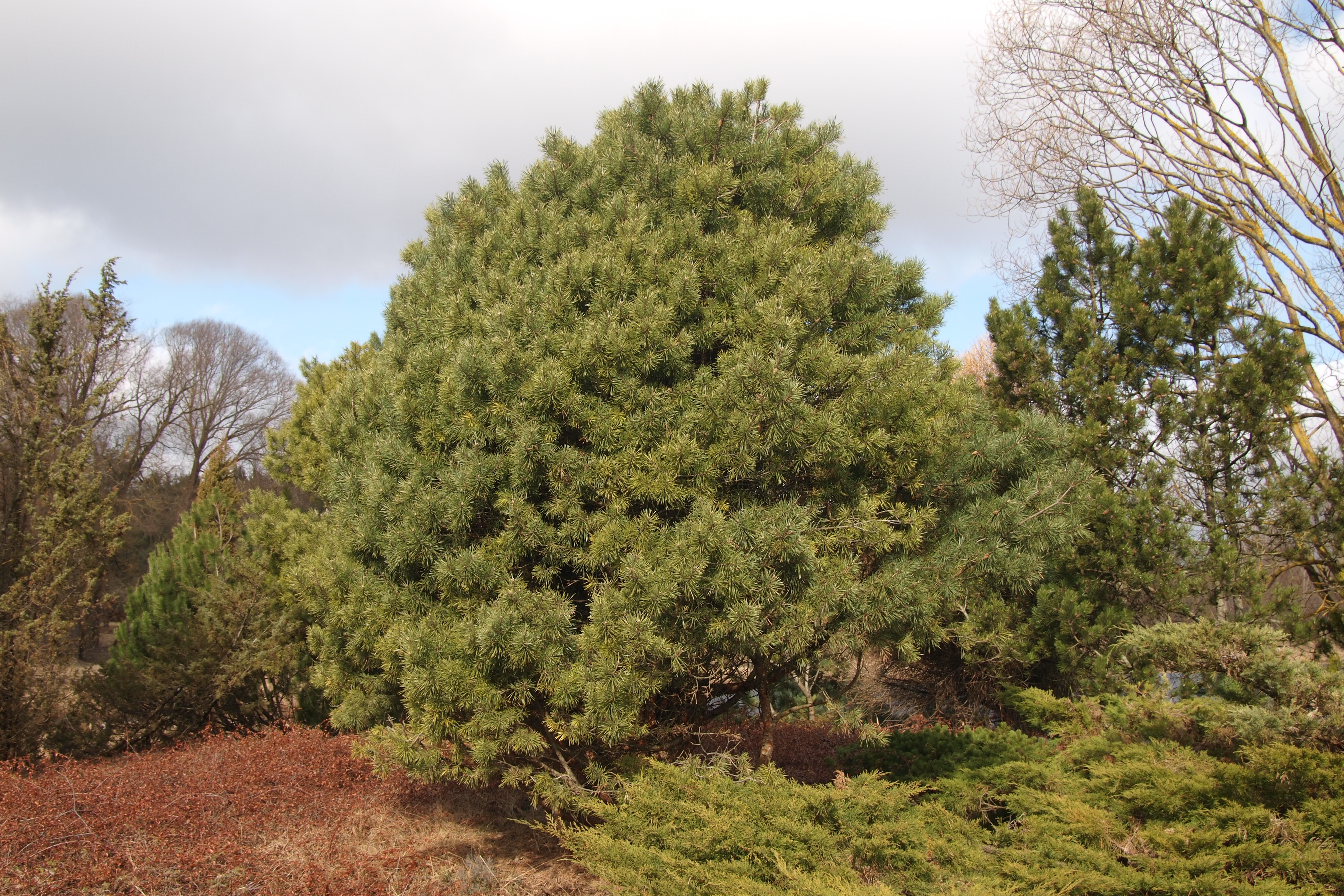 Morfoloģija. Mūžzaļš, jaunībā plati eliptisks, vēlāk ieapaļš, 2-3 (5) m augsts un tikpat plati sazarojies koks. Dzinumi sākumā zaļgani, vēlāk bāli brūnganpelēcīgi, rievaini. Pumpuri 5(6), cilindriski, strupi, oranžbrūni, sveķaini, 12-15 mm gari, 5 mm plati. Skujas sudrabaini zilganpelēkas, vērstas dzinuma gala virzienā, 4-6,5 cm garas, blīvas, nevienmērīgi izlocījušās līdz taisnas, labi izteiktās atvārsnīšu līnijas skujas abās pusēs skujojumam piedod zilganpelēku nokrāsu. Gada pieaugums formai 15-20(25) cm.