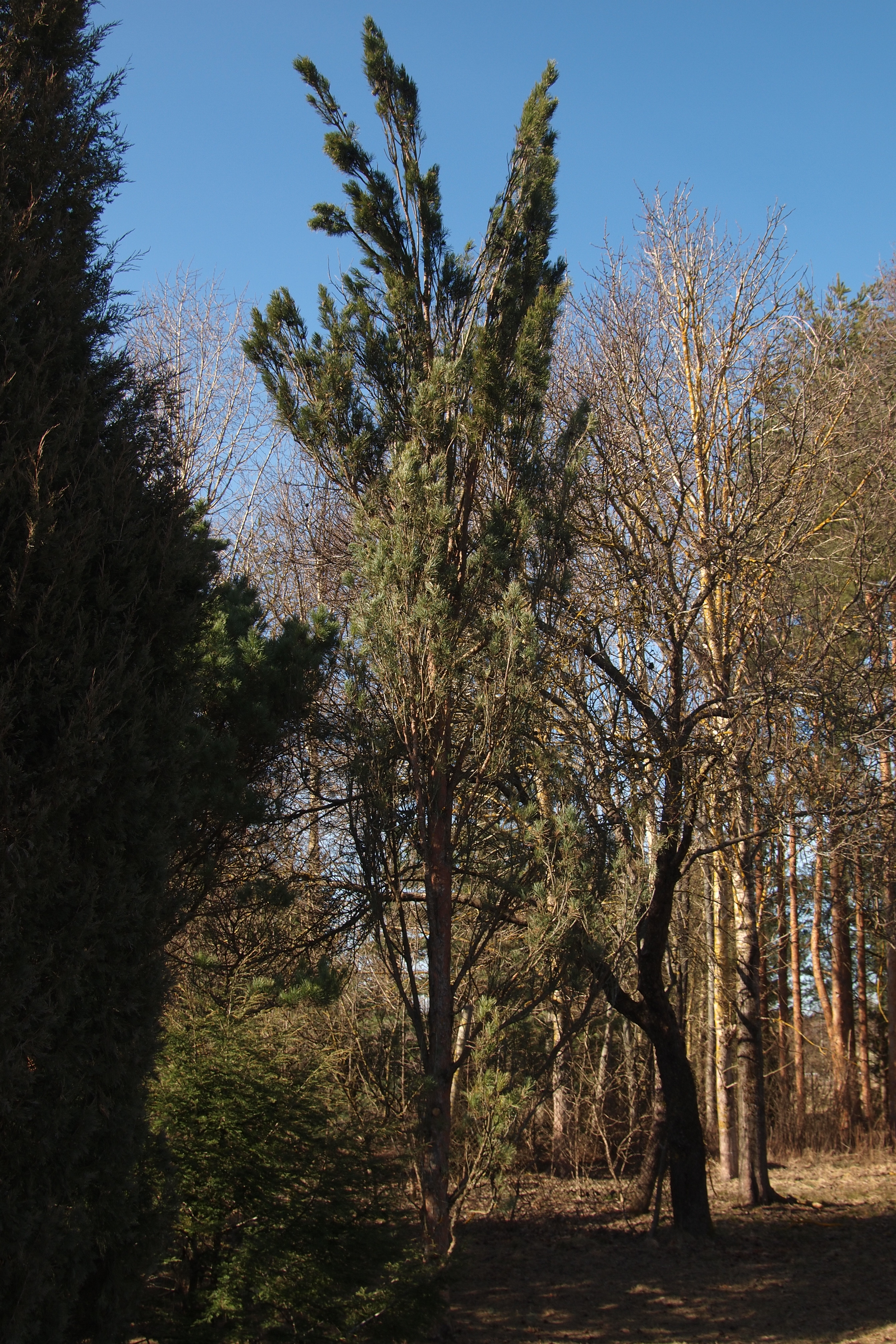 Morfoloģija. Mūžzaļš, spēcīgi augošs, kolonveidīgs koks, augstumā pārsniedz 10 m, ar stumbram ± paralēliem, stāviem skeletzariem un dzinumiem. Skujas zilganzaļas. Čiekuri sīki, pelēcīgi, olveidīgi. NBD Salaspilī jau augstāka par 8 m, ražo čiekurus.