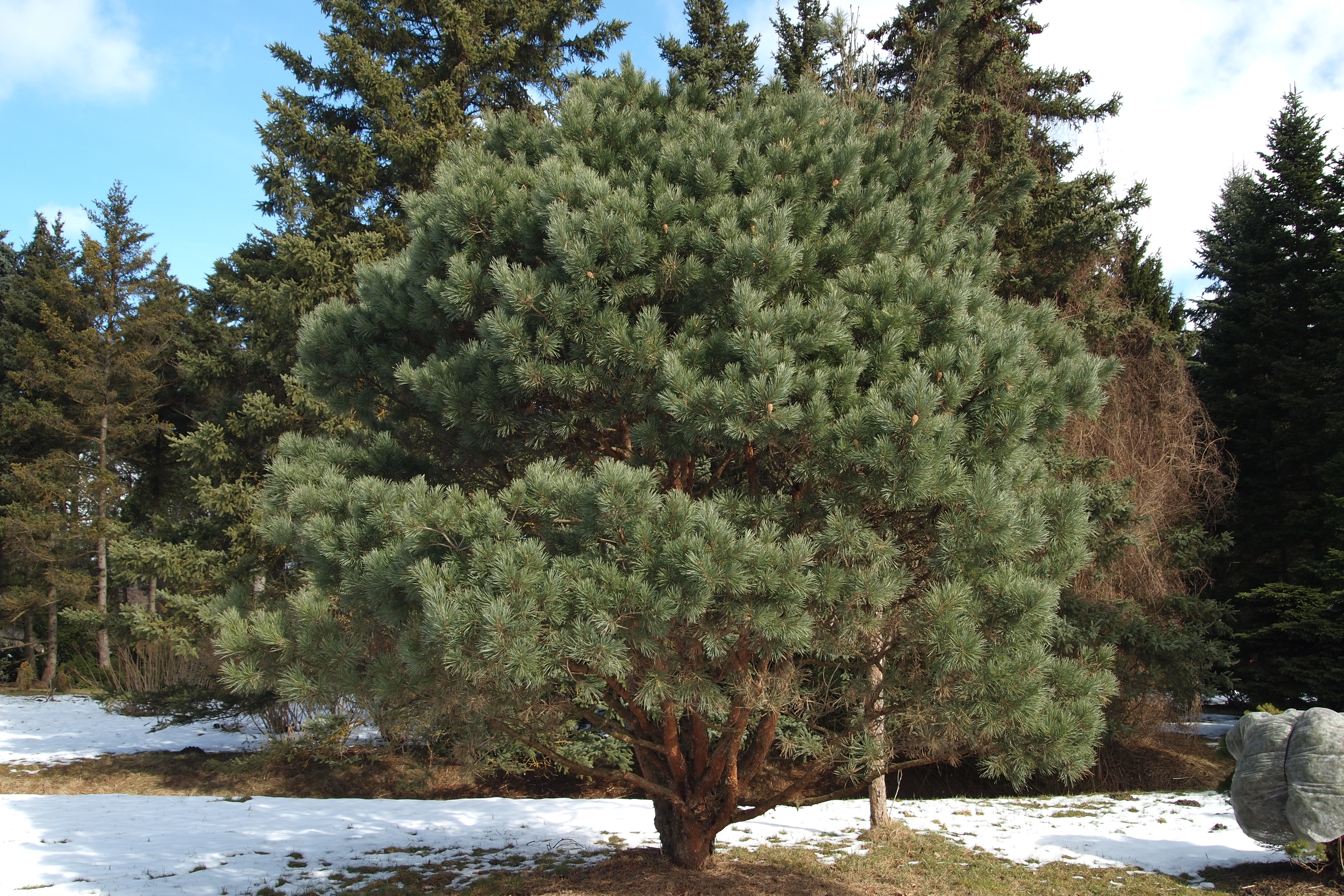 Morfoloģija. Mūžzaļa zema šķirne. Sākumā plati koniska, vēlāk ieapaļa, nereti cik plata tik gara. Skeletzari aug uz āru un izliecas uz augšu, paceļas arī dzinumu galotnes. Gada garuma pieaugums 15-20 cm. Pumpuru parasti 3(4), 7-12 mm gari, olveidīgi, sveķaini. Skujas 4-8 cm garas, tumši zaļas, taču, pateicoties atvārsnīšu joslām, tām ir izteikti zilgana nokrāsa, izliektas un izļodzījušās.