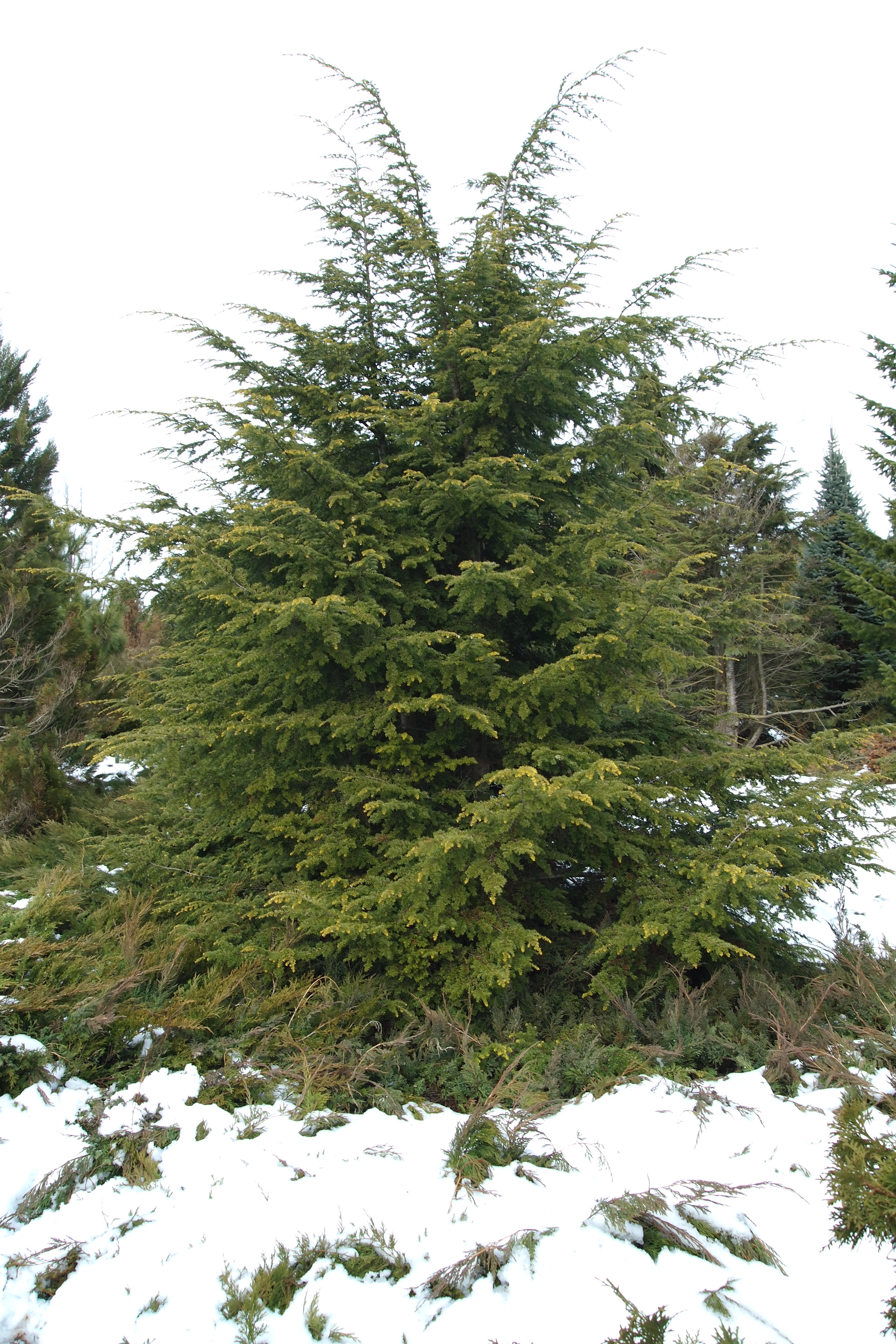 Morfoloģija. Mūžzaļa, krūmveida pundurforma, platāka nekā augstāka, ar spalvveidīgiem nokareniem zariem. 10 gados sasniedz 1,5 m augstumu.