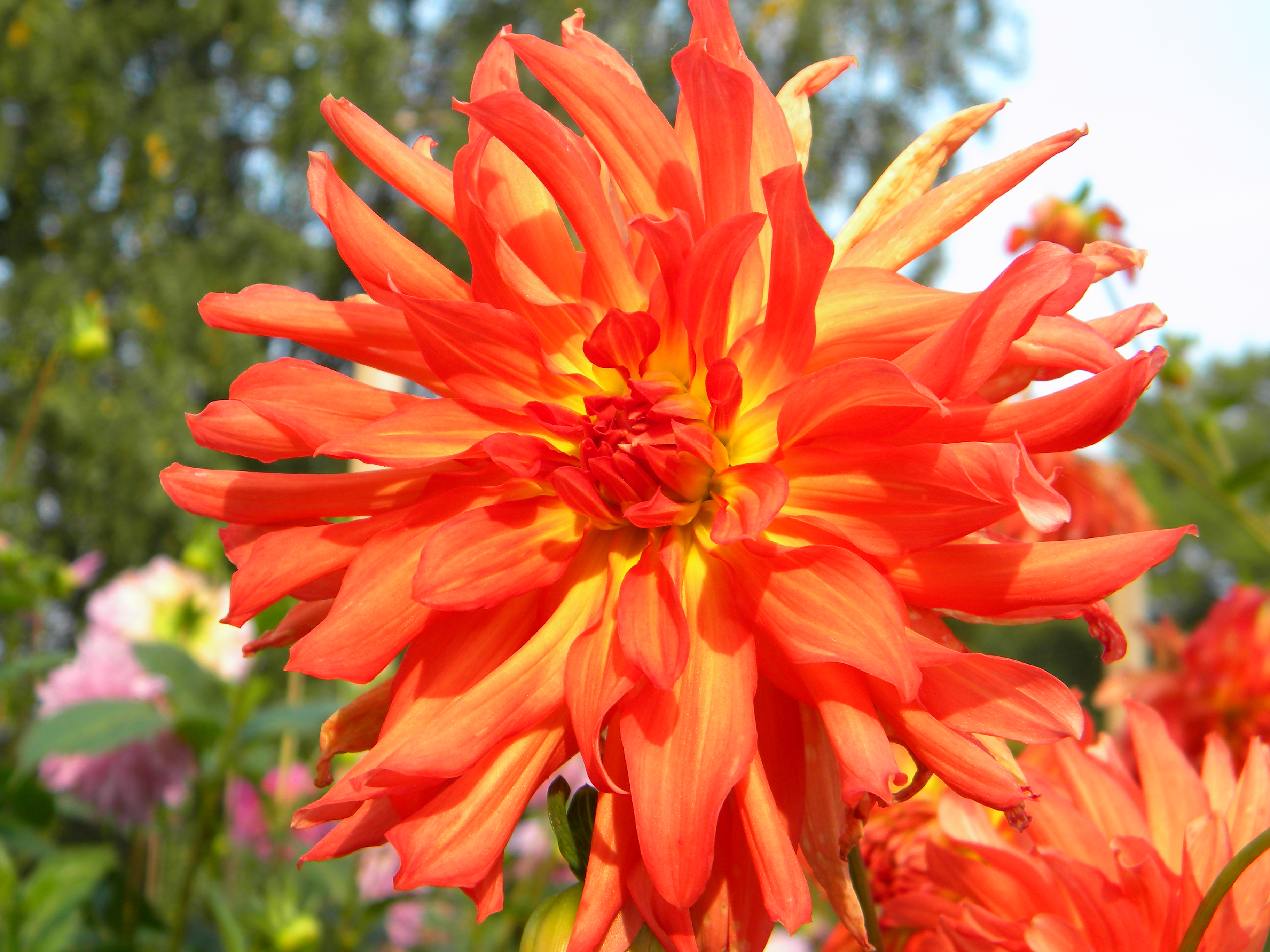 Morfoloģija. Pieder platziedu – kaktu dāliju grupai. Daudzgadīgs lakstaugs ar gumveida saknēm. Cers kompakts, 50-60 cm diametrā, sasniedz 0,9 m augstumu. Lapas tumši zaļas, ik pēc posma pretējs lapu pāris, lapojums kompakts, dekoratīvs. Ziedkopas pamatkrāsa piesātināti oranža, tās centrālā daļa dzeltena, saulē neizbalo, vidēji blīva, 15-17 cm diametrā. Ziedneši gari, izturīgi, paceļas pat 30-40 cm virs lapojuma.