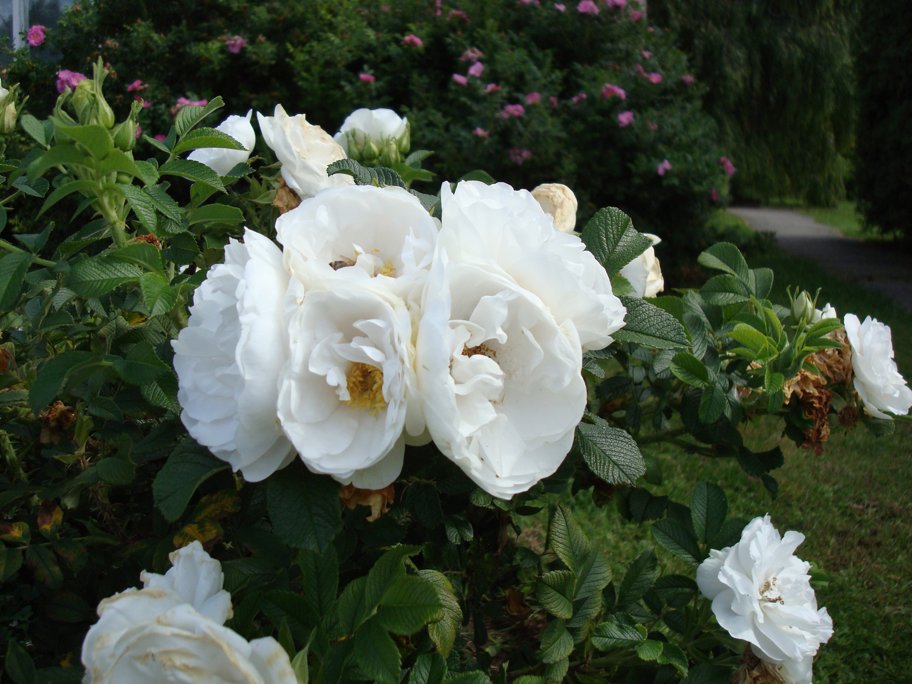 Morfoloģija. Krūms kompakts, nedaudz izplests, 0,4-0,5 m augsts, biezi zarots, ar daudziem dzeloņainiem dzinumiem. Lapas tumši zaļas, ādainas, spīdīgas, ar izteiktu rievojumu. Ziedi tīri balti, lieli (7-9 cm), bagātīgi pildīti, (25-35 vainaglapas), smaržīgi, sakārtoti pa 5-9 lielās ziedkopās. Zied bagātīgi un gandrīz nepārtraukti no jūnija vidus līdz salam, daļa noziedējušo ziedu veido augļus, tādēļ nevajadzētu pārcensties ar noziedējušo ziedu apgriešanu.