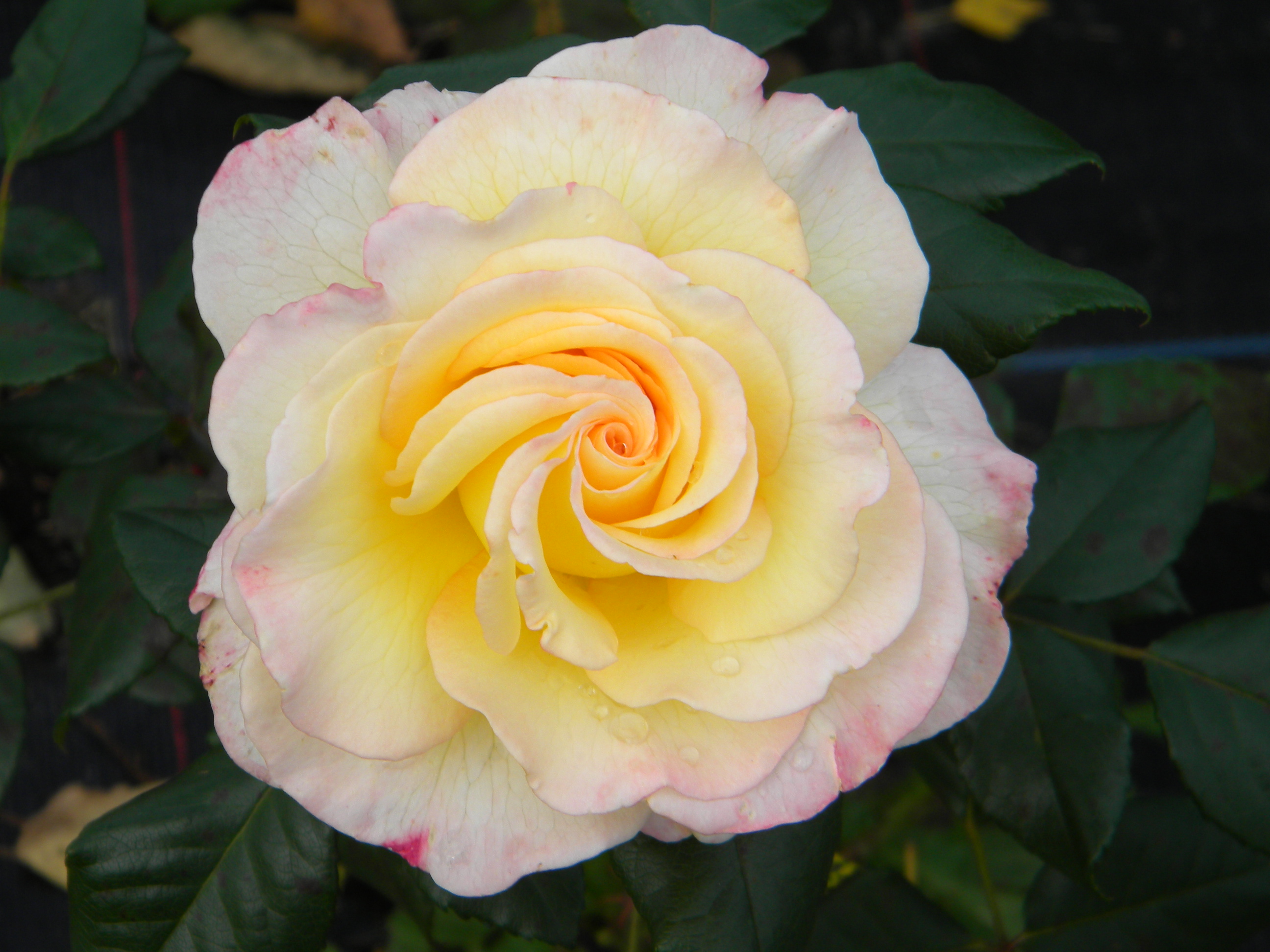 Morfoloģija. Krūms daļēji izplests, noturīgs, spēcīgi zarots, 0,8-1,0 m augsts. Lapas lielas, tumši zaļas, spīdīgas. Ziedi krēmkrāsas līdz gaiši dzelteni, ar persiksārtu vainaglapu apmali, ziedēšanas laikā krāsas pakāpeniski “pārlejas” kļūstot bālākas. Ziedi lieli (10-12 cm), ļoti pildīti (40 un vairāk vainaglapas), izkārtojušies pa 3-5 ziedkopā, tiem spēcīgs augļu aromāts, bagātīgi zied no jūlija līdz oktobrim.