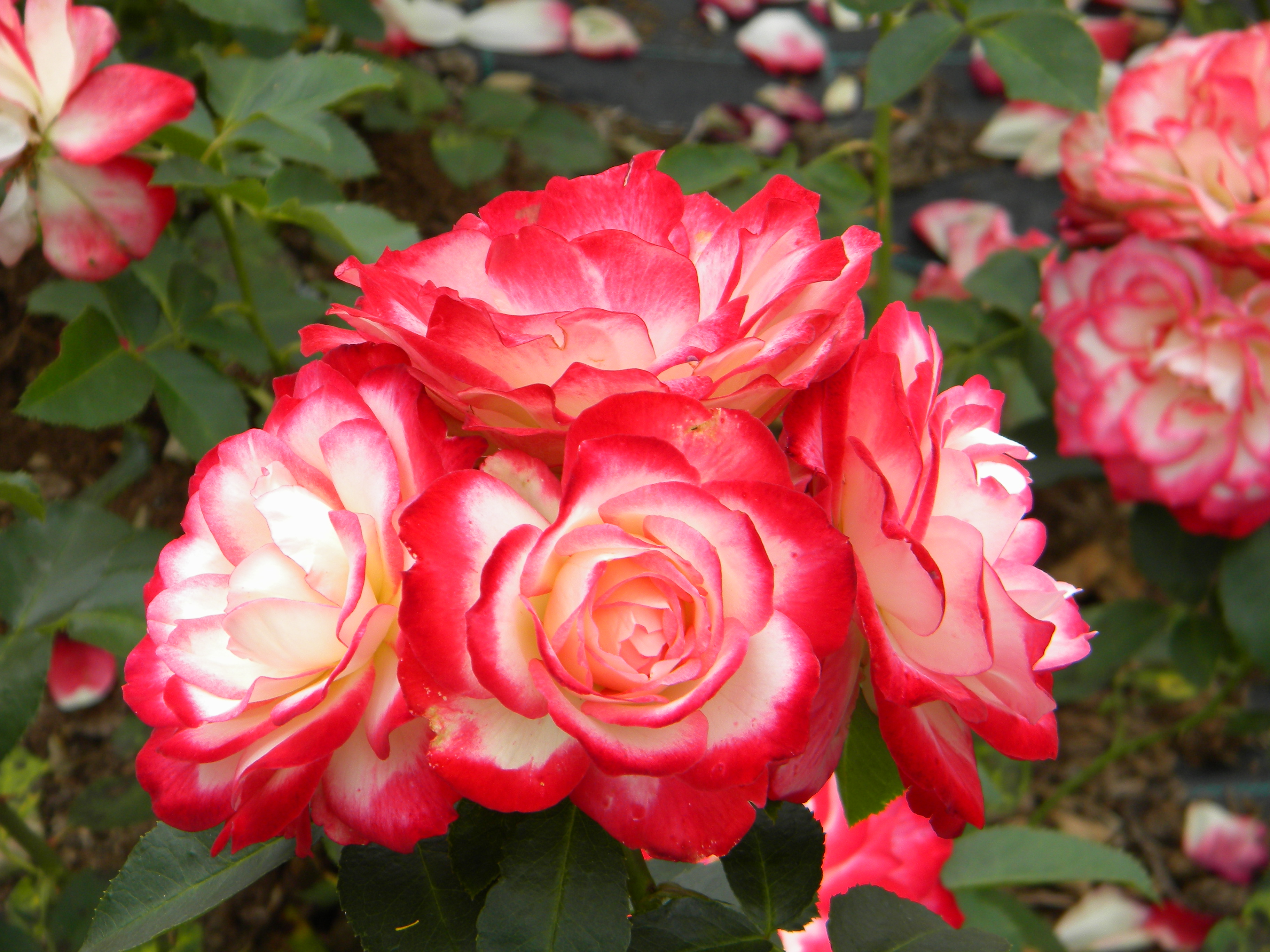 Morfoloģija. Krūms stāvs, labi zarots, kompakts, kupls, 0,6-0,7 m augsts. Lapas tumši zaļas, izteikti spīdīgas, dekoratīvs lapojums. Ziedi krēmbalti ar aveņkrāsas apmali, kas plaukstot kļūst piesātināti asins sarkana, lieli (8-10 cm), bagātīgi pildīti (26-40 vainaglapas), ilgi saglabā skaistu formu, tiem maiga, viegli salda smarža, sakārtoti pa 1-7 akurātās ziedkopās dzinumu galos. Zied krāšņi visu vasaru līdz vēlajām rudens salnām.
