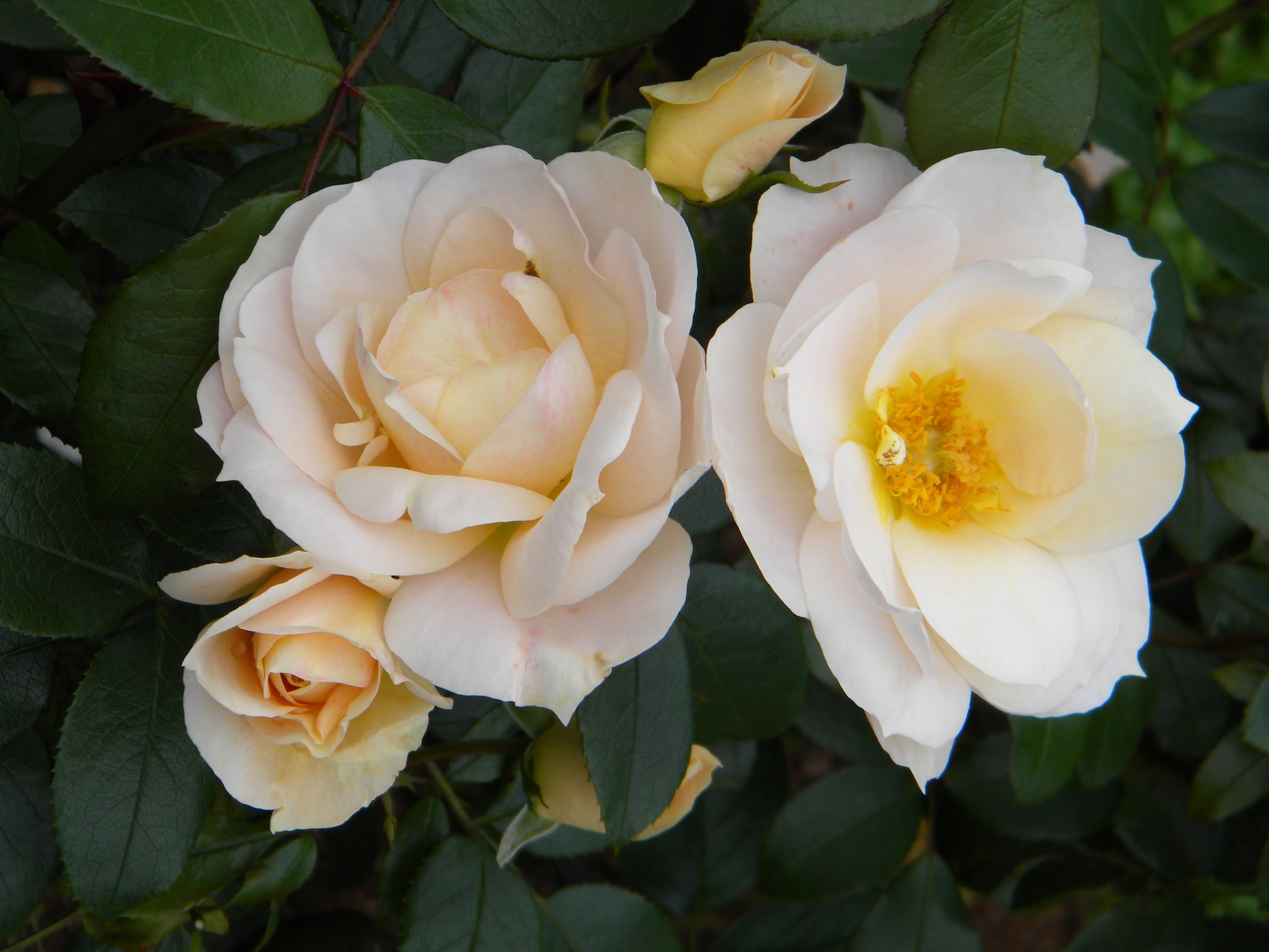 Morfoloģija. Krūms izplests, labi zarots, spēcīgi, 0,5-0,6 m augsti dzinumi. Lapas lielas, tumši zaļas, spīdīgas, ādainas, ļoti veselīgs lapojums. Ziedi sākumā krēmdzeltenā krāsā, izziedot kļūst krēmbalti, vidēji lieli (7-8 cm), bagātīgi pildīti (25-40 vainaglapas), vieglu smaržu, sakārtojušies ziedkopās pa 3-5 katrā. Zied krāšņi līdz vēlam rudenim.