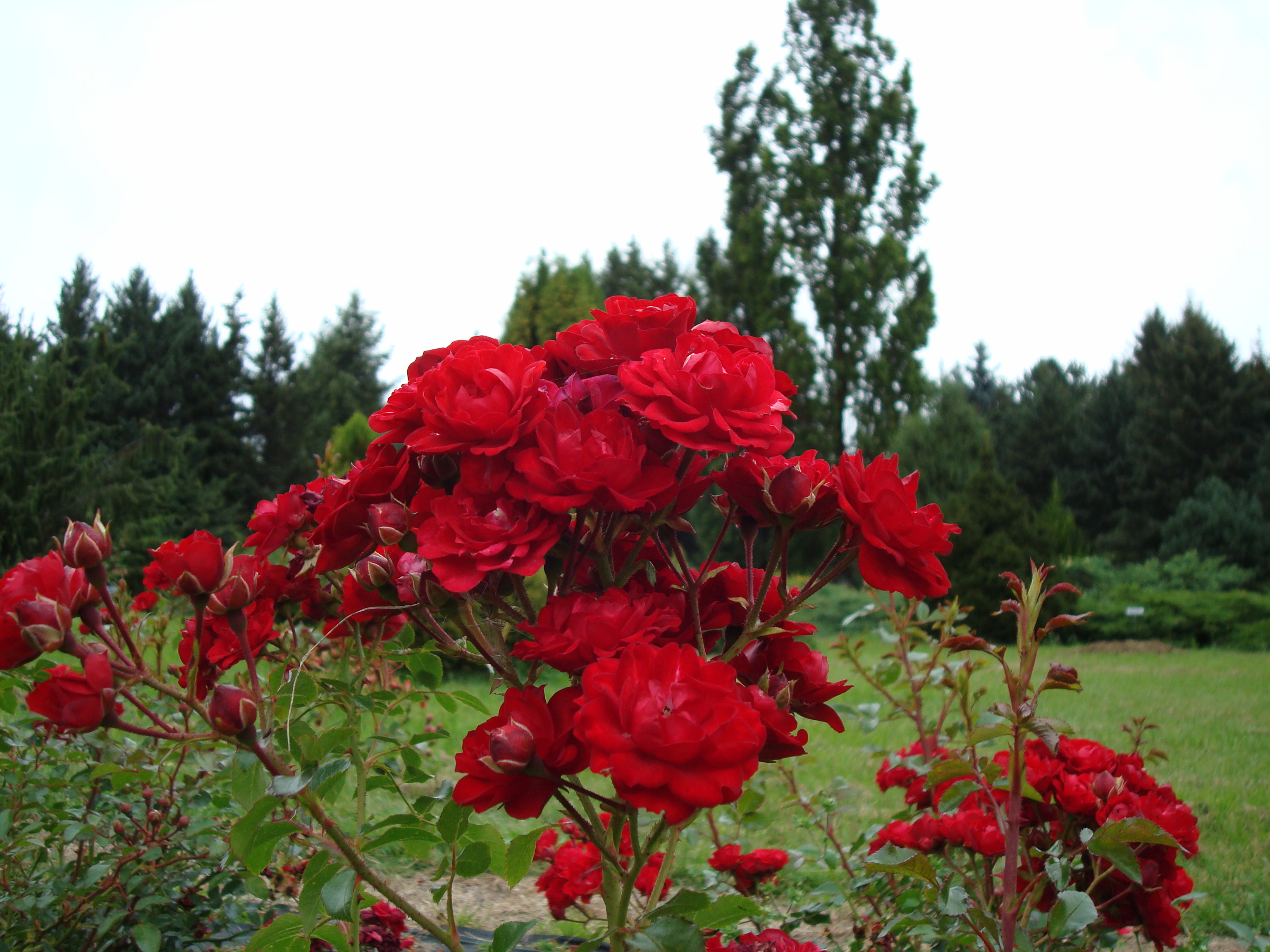 Morfoloģija. Krūms plati izplests, biezi zarots, centrālie dzinumi 0,3-0,4 m augsti, sānu dzinumi noliecas. Lapas tumši zaļas, sīkas, spīdīgas, biezas, veselīgas. Ziedi spilgti sarkani, sīki (2,5-3 cm), puspildīti (9-15 vainaglapas), nesmaržo, sakārtoti ļoti lielās, bagātīgās ziedkopās pa 11-25 katrā, pārziedējušie ziedi laikus jānogriež, lai veicinātu jaunu pumpuru veidošanos. Zied krāšņi un gandrīz nepārtraukti līdz vēlam rudenim.
