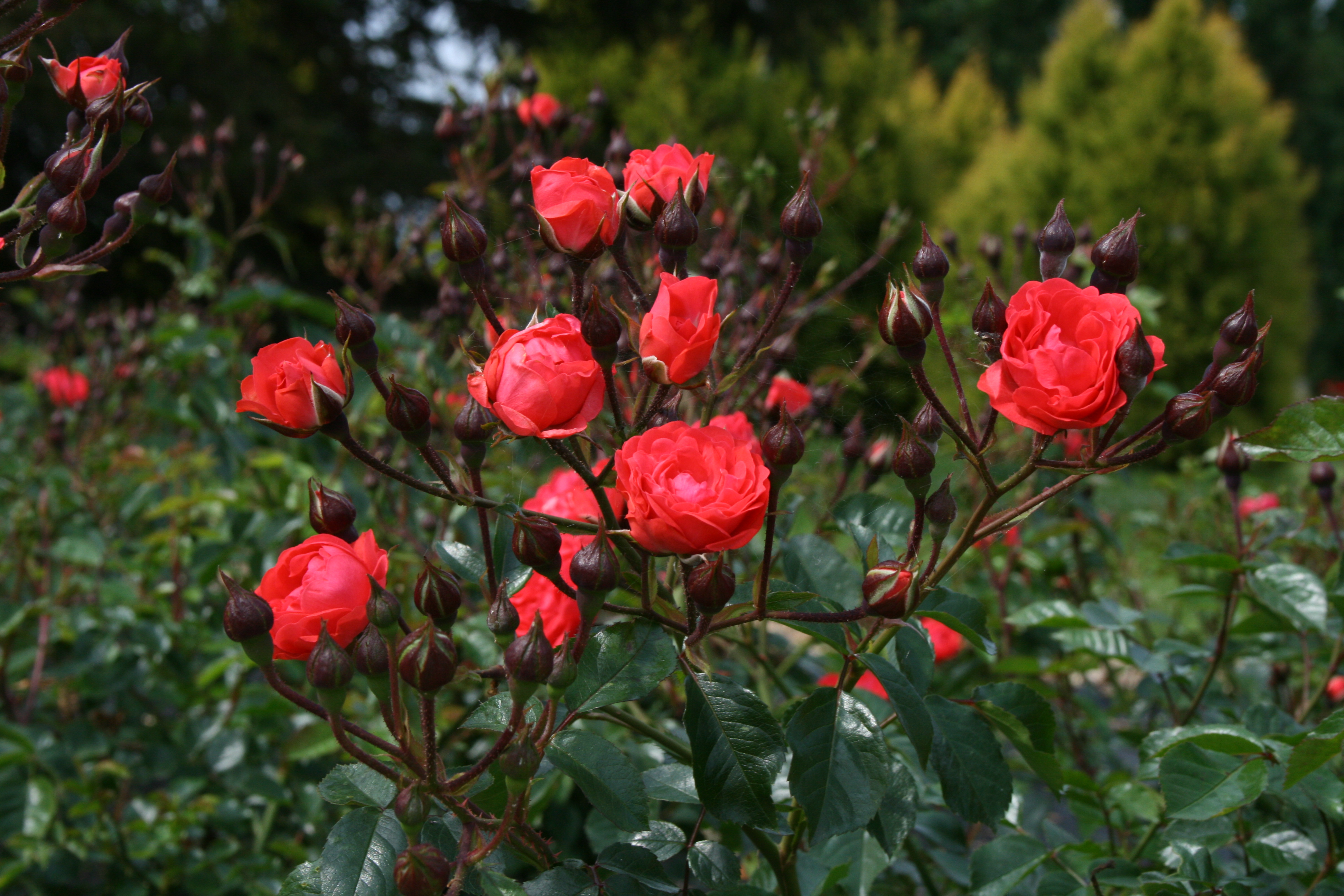 Morfoloģija. Krūms izplests, bagātīgi zarots, spēcīgs, 0,5-0,6 m augsts. Lapas vidēji lielas, pavasarī zaļas ar brūnganu nokrāsu, vēlāk tumši zaļas, spīdīgas. Ziedi gaiši sarkani ar liesmas nokrāsu, nelieli (3-4 cm), puspildīti (17-25 vainaglapas), sakārtoti pa 15-35 lielā ziedkopā, nesmaržo. Zied bagātīgi ar nelieliem pārtraukumiem līdz vēlam rudenim.