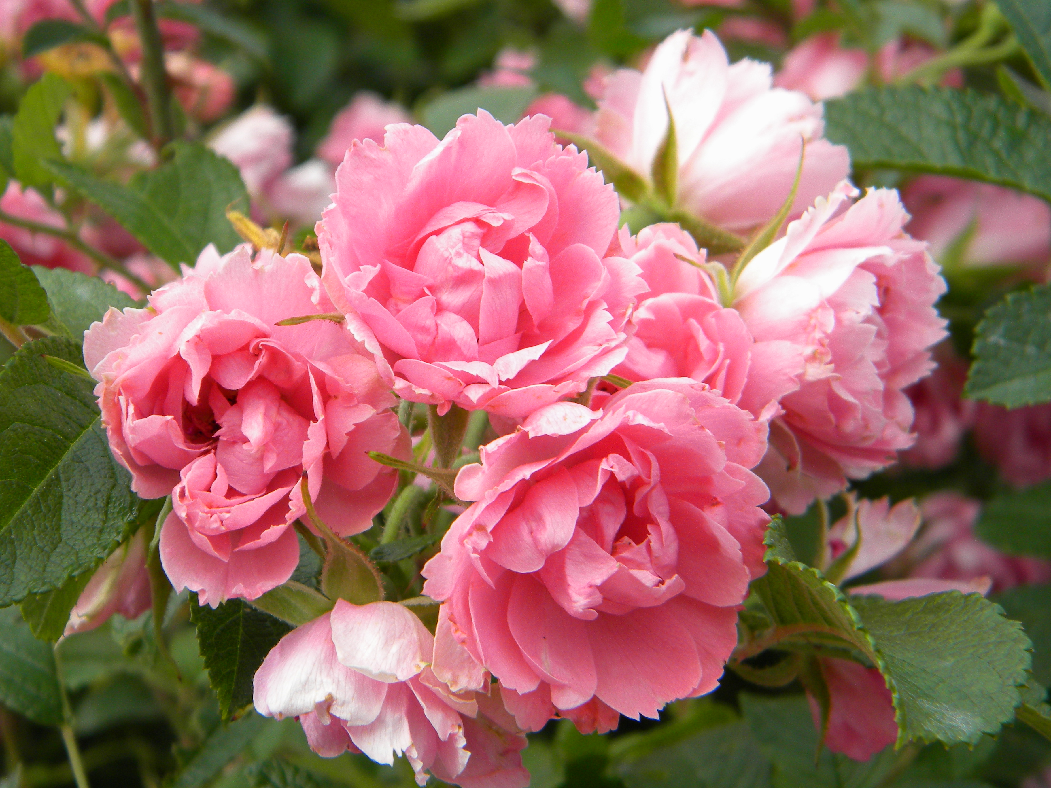 Morfoloģija. Krūms piramidāli izplests, biezi zarots, 1,2-1,5 m augsts, ļoti dzeloņainiem dzinumiem. Lapas nelielas, zaļas, rievainas, maz spīdīgas. Ziedi piesātināti tīri rozā krāsā, ļoti sīki (2-3,5 cm), bagātīgi pildīti (25-30 vainaglapas), ziedlapiņu malas šķeltas, ļoti atgādina neļķes ziedu, sakārtojušies pa 15-25 lielās ziedkopās. Zied bagātīgi līdz vēlam rudenim.