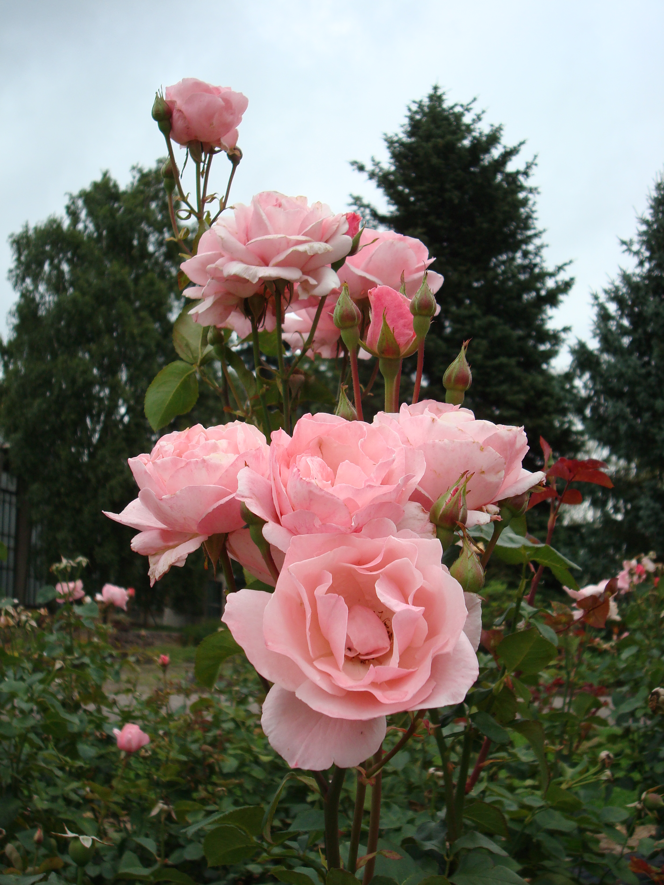 Morfoloģija. Krūms izteikti stāvs, spēcīgi zarots, 0,7-0,9 m augsts. Lapas pavasarī gaiši zaļas ar brūnganu nokrāsu, vasarā tumši zaļas, lielas, spīdīgas. Ziedi tīri rozā, saulē balo, lieli (9-11 cm), pildīti (20-25 vainaglapas), ziedpumpuri attīstās uz netipiski gariem, sazarotiem ziedkātiem, izkārtojušies pa 3-10 ziedkopā, tiem viegla smarža. Zied ar aristokrātisku eleganci no jūlija līdz vēlam rudenim.