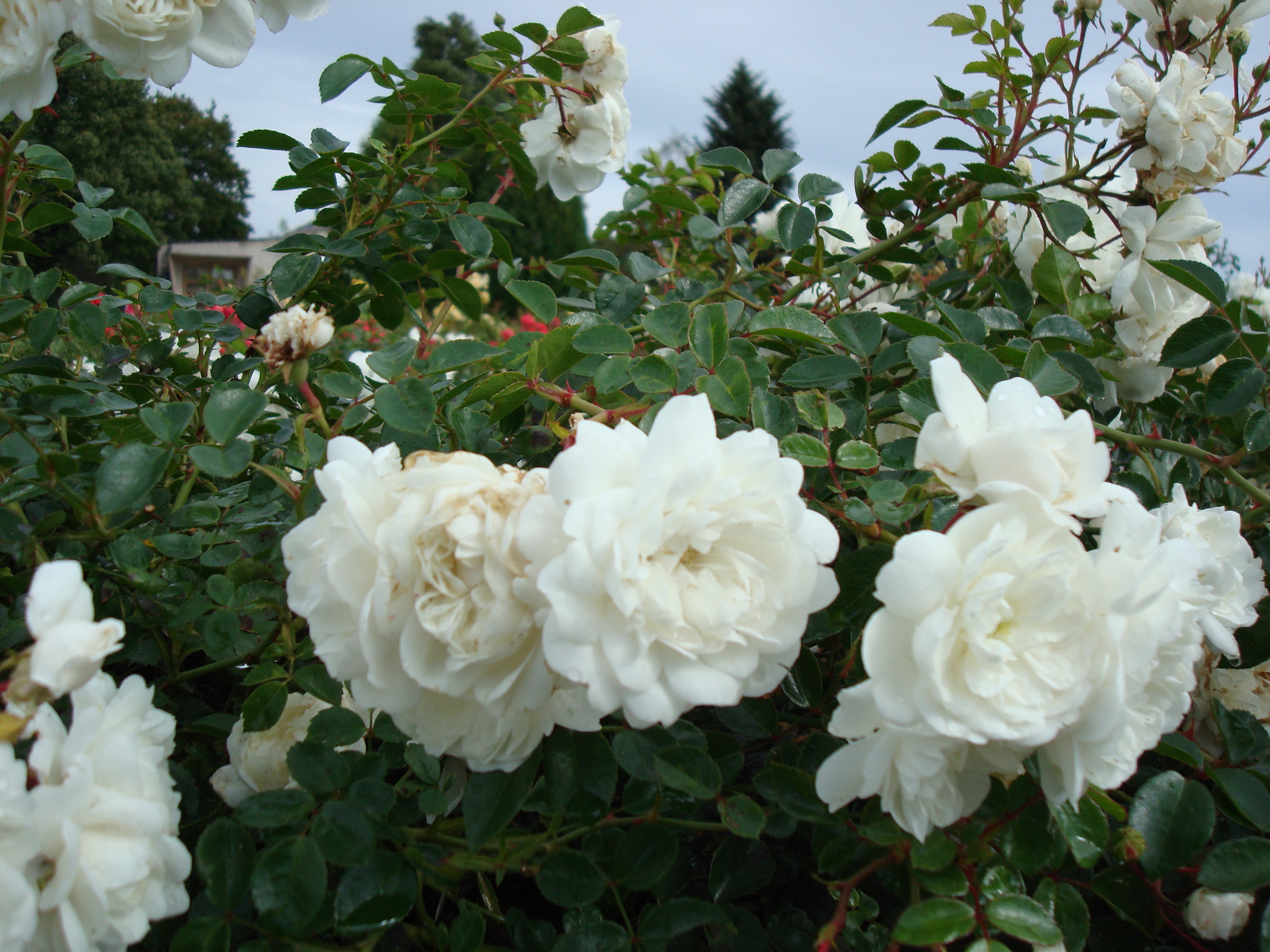 Morfoloģija. Krūms plati izplests, biezi zarots, sākumā dzinumi aug apmēram 0,3-0,4 m stāvus, tad noliecas, sedzot augsni ar 0,5-0,7 m gariem, lokaniem dzinumiem. Lapas piesātināti tumši zaļas, spīdīgas, ādainas, sīkas. Ziedi tīti balti, vidēji lieli (4-6 cm), pildīti (17-25 vainaglapas), sākumā lodveida, vēlāk plakani, ar maigu smaržu, sakārtoti pa 3-9 kompaktā ziedkopā. Zied atkārtoti līdz vēlam rudenim.