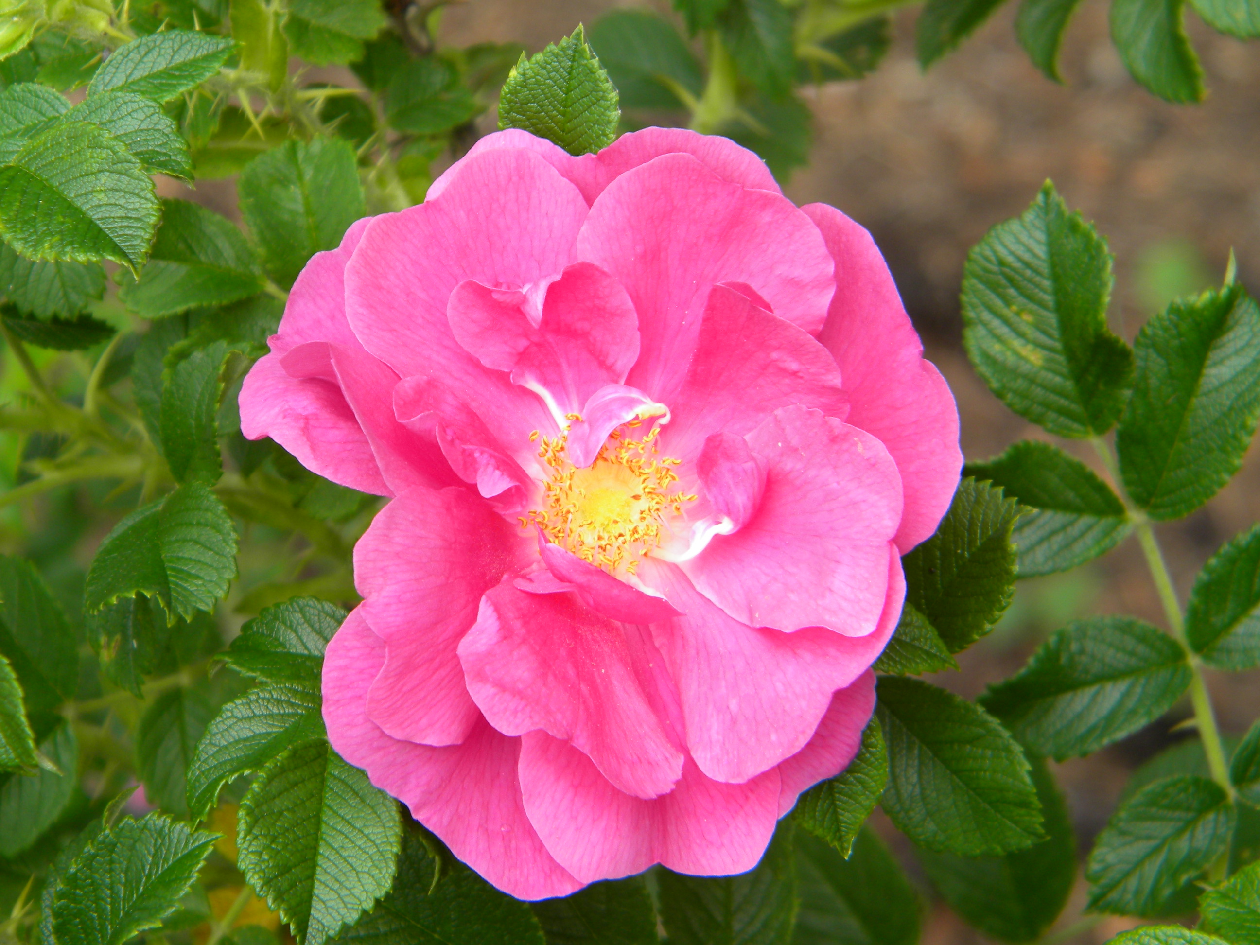 Morfoloģija. Krūms izplests, biezi zarots, 0,7-1,0 m augsts, dzinumi klāti ar daudziem sīkiem, gaiši zaļiem, uz leju noliektiem dzeloņiem. Lapas nelielas, tumši zaļas, spīdīgas, rievainas. Ziedi aveņsarkani ar lillā nokrāsu, izziedot nedaudz balo, vidēji lieli (6-7 cm), puspildīti (14-19 vainaglapas), šķīvjveida, pa 7-11 ziedkopā, tiem maigs mežrožu aromāts. Pēc noziedēšanas daļai ziedu veidojas augļus. Zied gandrīz nepārtraukti no jūnija sākuma līdz salam.