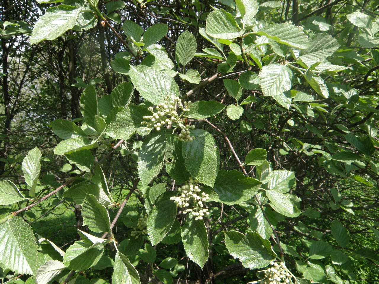 Morfoloģija. Vassarzaļš, līdz 10 m augsts koks vai krūms, ar kompaktu vainagu. Lapas 7 - 9 cm garas un 5,5 cm platas, otrādi olveida, daivas līdz 1/6 pret vidusdzīslu, ar 7-10 sānu dzīslu pāriem. Lapas plātnes pamats viegi noapaļots, ķīļveidīgs. Lapas plātnes apakšpuse pelēcīgi tūbaina. Ziedi saliktā vairogā, balti. Zied maijā, jūnijā. Augļi 9-11 mm lieli, ieapaļi, olveidīgi, oranži, lenticeles sīkas un vidējas, to daudzums palielinās virzienā uz augļa pamatu.