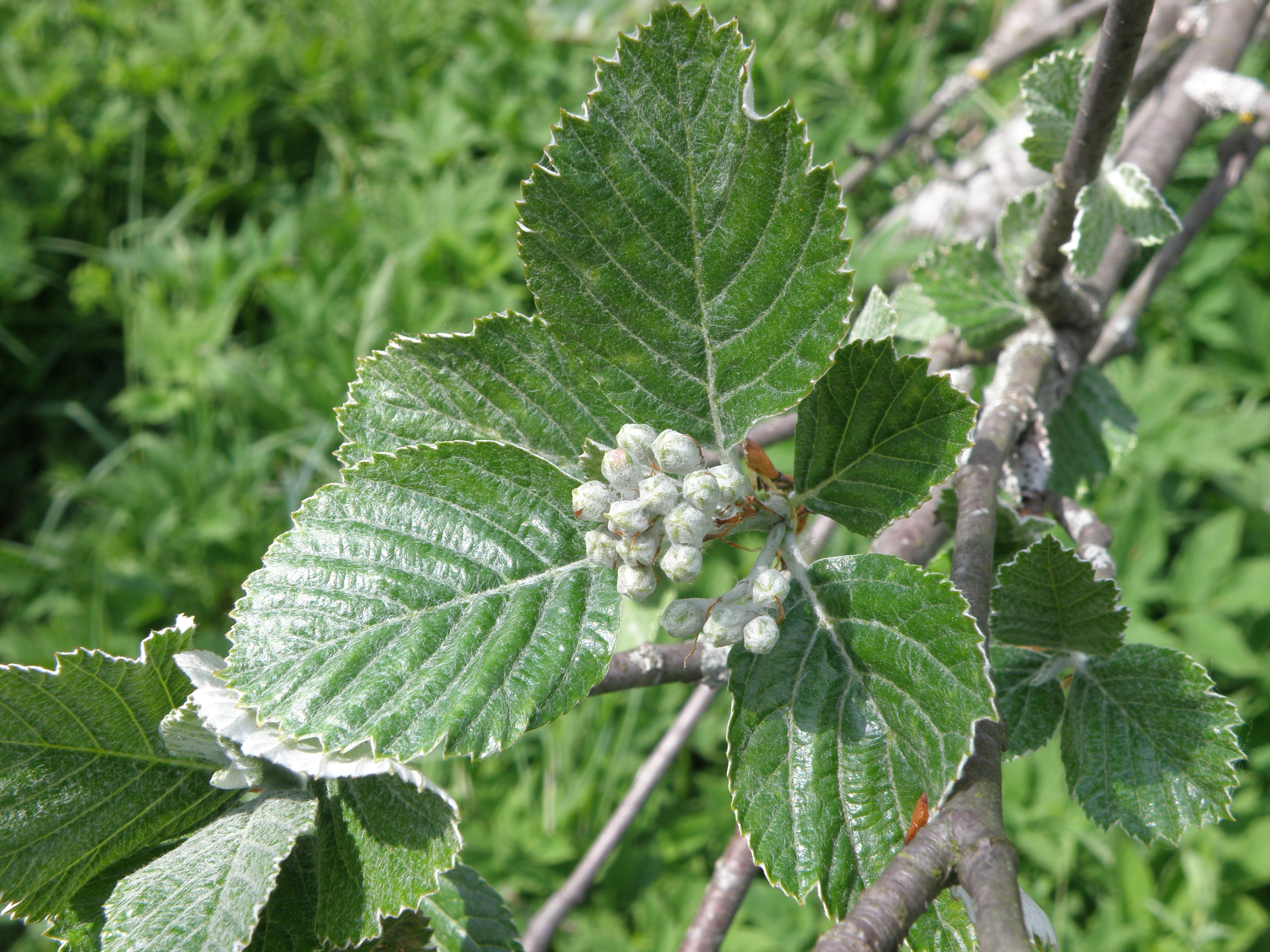 Morfoloģija. Vasarzaļš, līdz 1,5 m augsts krūms. Miza gaiši pelēka, jaunie dzinumi brūnsarkani. Pumpuri nedaudz mataini. Lapas veselas, 5-10 cm garas un 3-5 cm platas, ar 8-10 dzīslu pāriem, noapaļotas. Lapas plātnes apakšpuse gaiši pelēka, mataina, pie dzīslām kaila. Lapas mala ir sīki zobaina. Ziedi sakopoti saliktā vairogā, balti.