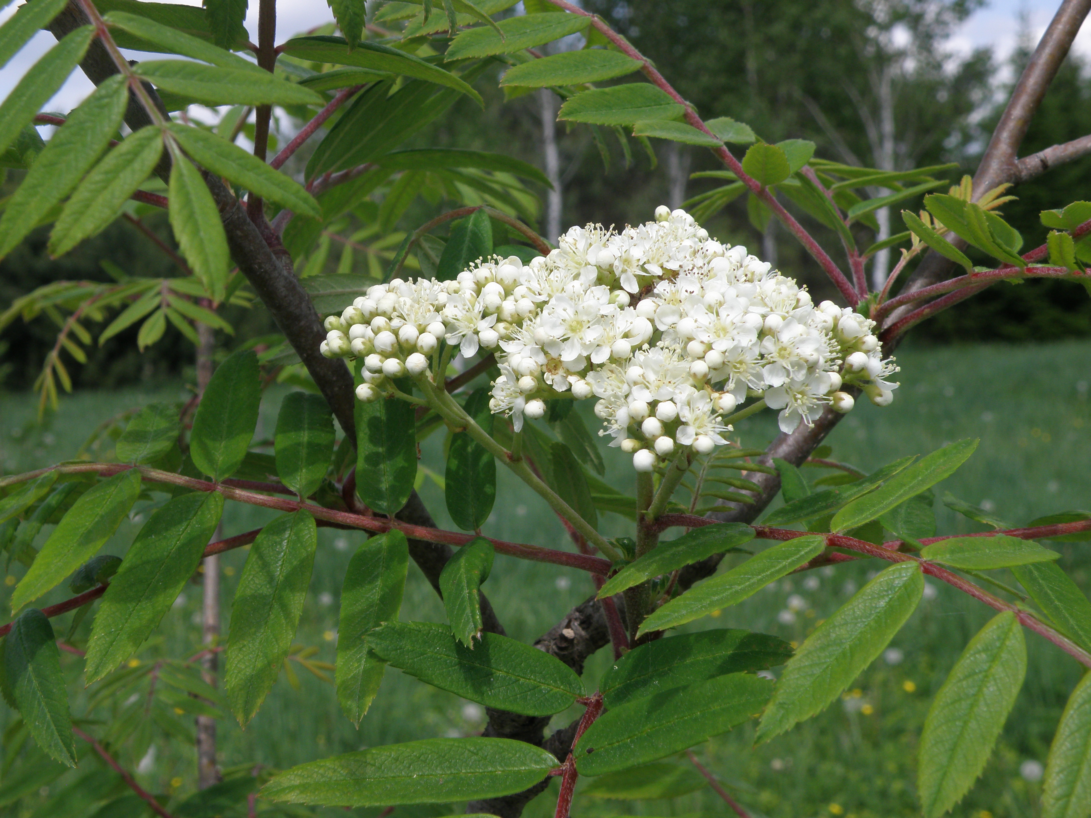 Morfoloģija. Vasarzaļš, līdz 5 m liels koks vai krūms. Miza gluda, pelēka. Jaunie dzinumi, kaili vai gandrīz kaili. Pumpuri olveidīgi nosmailoti, bieži ar matiņiem. Lapas nepāri plūksnaini saliktas 10-14 cm garas. Lapiņas lancetiskas, 3-5 cm garas. Ziedi sakopoti saliktā vairogā, ar stipru kodīgu smaržu, zied maijā, jūnijā. Augļi lodveida, 1-1,2 mm diametrā, sarkani, nogatavojas augustā, septembrī.