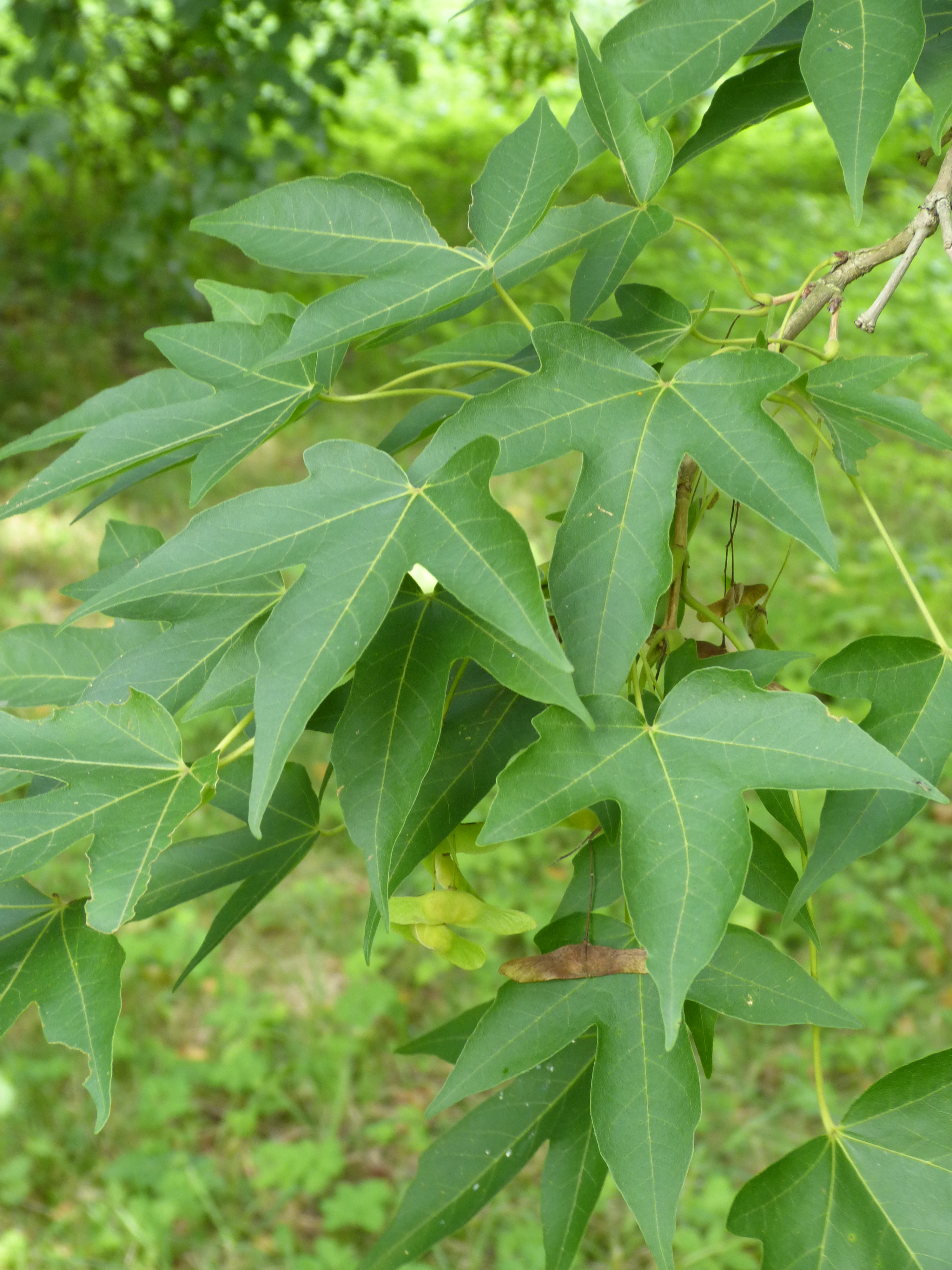 Morfoloģija. Koks, savvaļā līdz 25 m augsts. Miza dzeltenīgi gaišpelēka, lobās smalkās plēksnēs. Lapas ar 5 daivām, 7-12 cm garas, 9-16 cm platas, virspusē olīvzaļas, apakšpusē bālāk zaļas, pūkainas. Augšējās trīs daivas piecstūrainas, gari nosmailotas ar neasu galu, ar mazu neasu daiviņu abās pusēs tuvu vidum, apakšējās daivas mazas, strupas. Ziedkopa vairogveida, 10-12 cm gara; ziedi pa 10 vai vairāk, zaļgandzelteni. Spārnuļi 2-2,5 cm gari, dzeltenīgi, pūkaini. Spārni izplesti horizontāli. Riekstiņš plakans, samtaini pūkains. Zied maijā, nogatavojas septembrī.