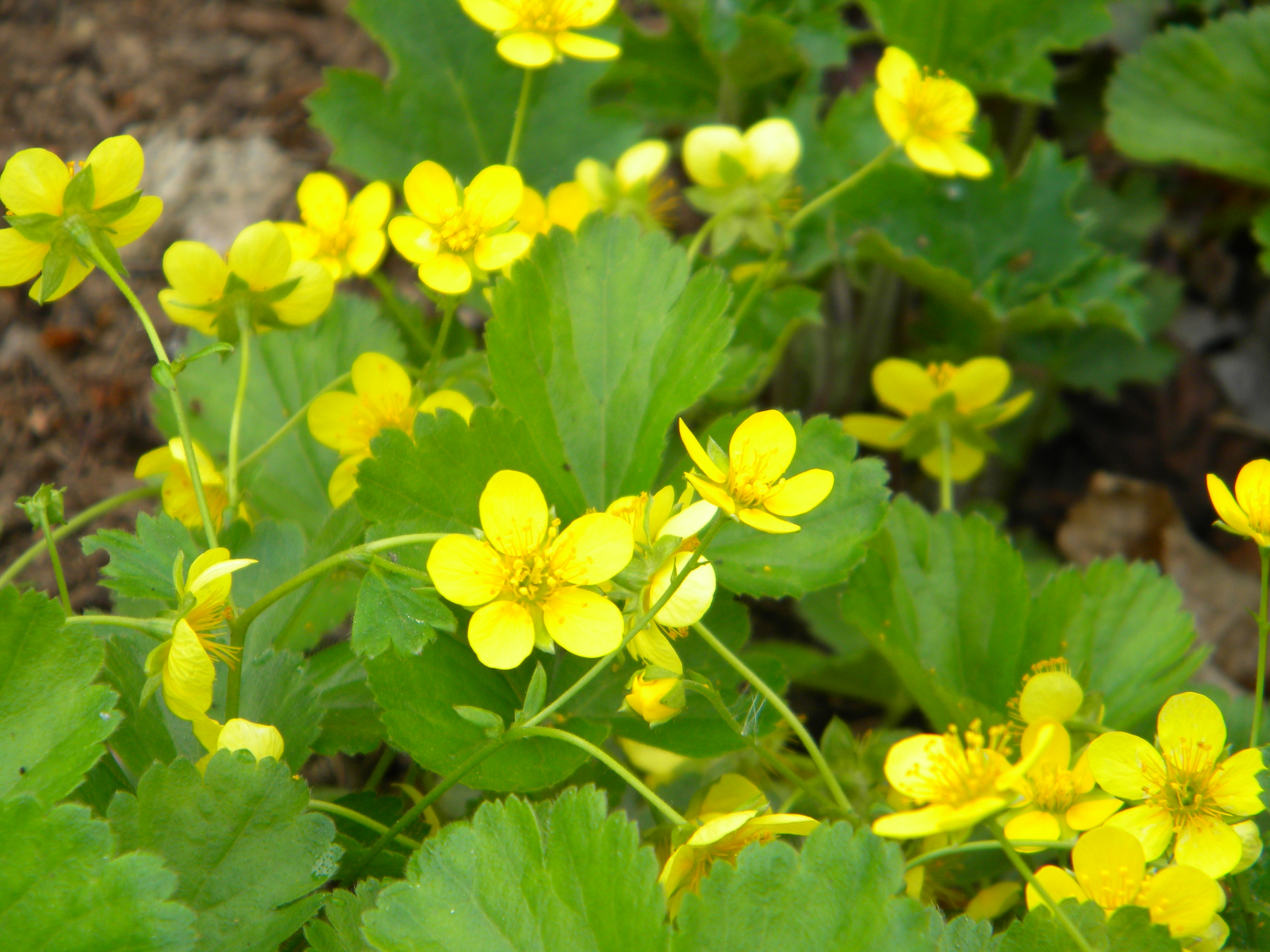 Morfoloģija. Daudzgadīgs rožu (Rosaceae) dzimtas lakstaugs, sasniedz tikai 10 cm augstumu. Tā sakneņi ložņājoši, veido sāndzinumus, auga izplešanās intensitāte vidēja. Lapas garos kātos, zaļas, apgriezti olveida, spīdīgas, ādainas, saliktas no trim lapiņām, ziemzaļas, ar robotām malām. Ziedi mazi, zeltdzelteni, sakārtoti pa 3-7 skrajās čemurveida ziedkopās, tie līdzīgi zemenēm, zied maijā, jūnijā.